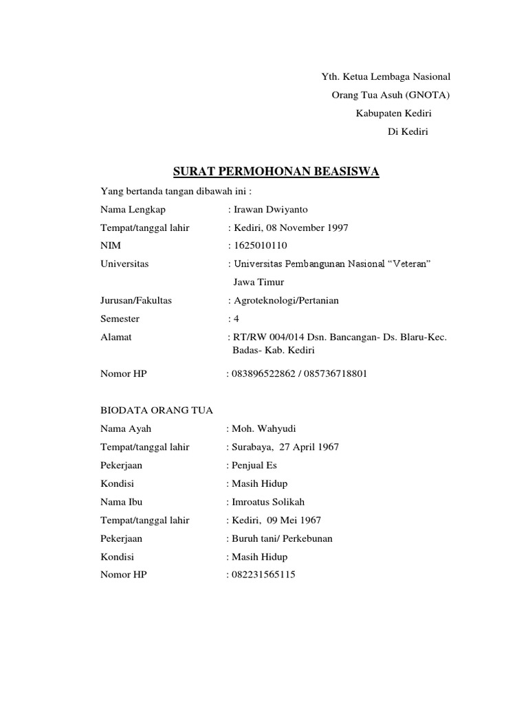 Contoh surat permohonan bantuan beasiswa gnota. Surat permohonan beasiswa sekarang ini admin akan membahas artikel tentang surat permohonan beasiswa namun sebelum admin menjelaskan tentang cara membuat surat permohonan beasiswa berikut contohnya. Surat permohonan beasiswa dengan hormat berdasarkan surat edaran pengurus kabupaten kediri nomor 36 pl gnota kab. Apalagi saat ini semakin banyak beasiswa yang di siapkan oleh pihak sekolah untuk para siswanya.